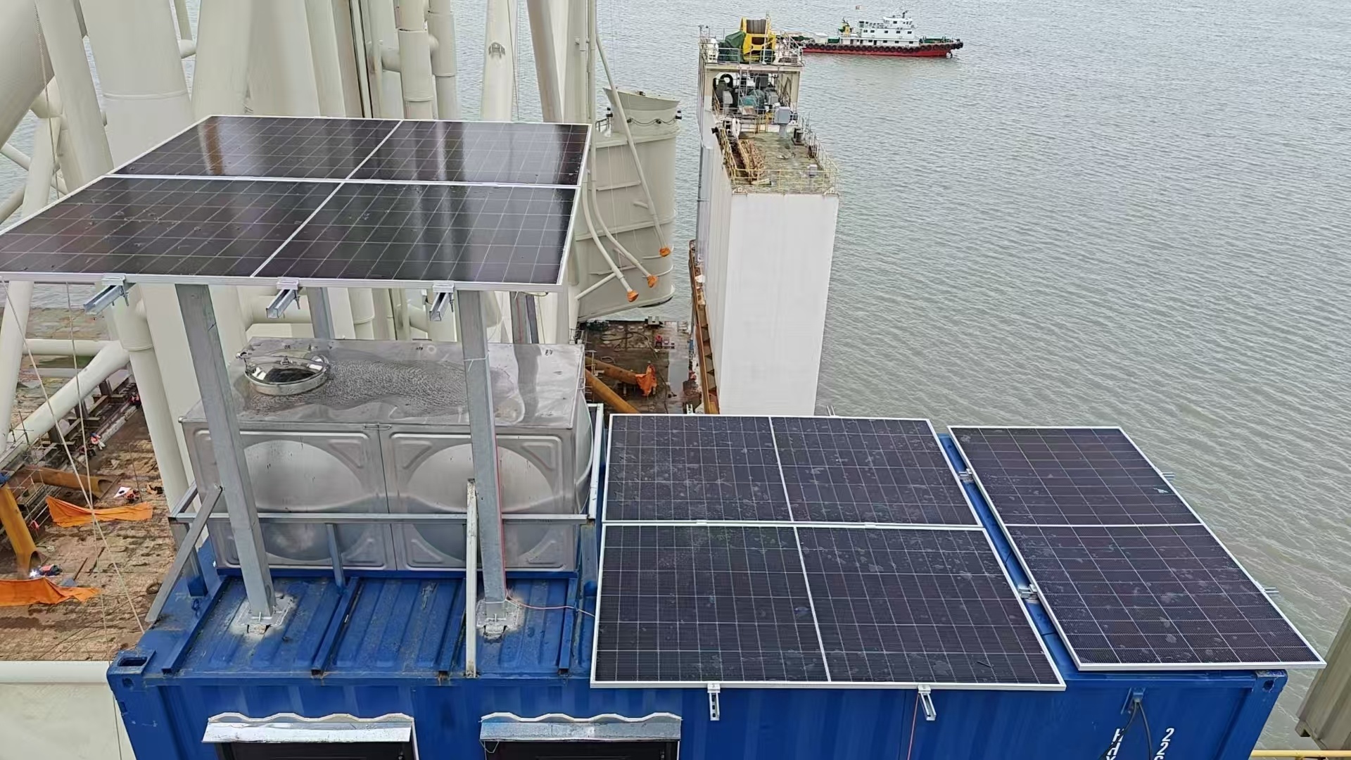 本项目由中集集光系统集成,安装在德浮号半潜船上,装机容量为3.5kw的光伏及10kwh的储能,离网光储系统主要为船上冰箱及空调提供稳定电力供应。